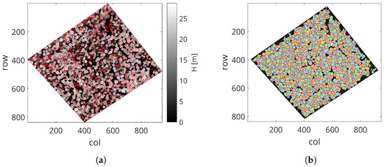 (a) Tree top detection results with variable size convolution window. (b) Raster CHM segmentation obtained with the marker controlled watershed algorithm.