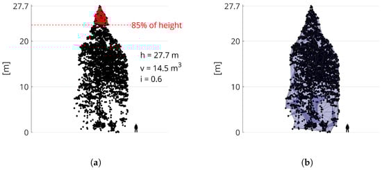 In order to compare and group tree shapes in step 3, a set of descriptive features is required. Thus, the total height h, upper crown (i.e., points located in the upper 15% of the crown) convex volume v and median return intensity i (normalized by the [0.05, 0.95] quantile range) are computed for each segment. These upper crown features were chosen because for trees with a conical shape, they are less affected by poor segmentation than features that describe the lower parts of segments (cf. Figure 4a).