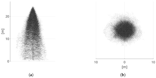 Using a custom built (Matlab based) application, the 3D tree shapes were manually delineated in the point cloud to produce a set of reference segments (cf. Figure 1d). The shape delineation process involved extracting subsets of the point cloud, visualizing them under different viewing angles and progressively removing points until a single tree was visible. In cases where trees were in very close proximity, horizontal cross sections were also used to separate adjacent crowns. Segments with an ambiguous shape (e.g., when there was a suspicion of the presence of multiple trees in a segment) were flagged and excluded from the validation dataset. The resulting reference dataset contained a total of 940 tree segments (754 coniferous, 122 deciduous and 64 unidentified or dead trees). These reference samples include a variability of height (age) and shape. Only the coniferous trees were used for validation.