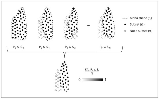 The shape probability is defined as the number of times a point was included in the alpha shapes of the ensemble divided by the ensemble size N (i.e., number of matching segments), as illustrated in Figure 6. For each set of points which form a segment, the shape probability is given by: