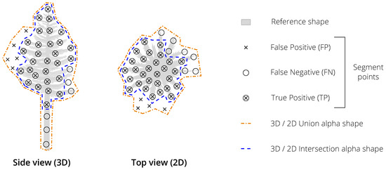 The unfiltered (initial) and filtered shapes were compared to the manually delineated reference shapes. The delineation performance (cf. Figure 7) was evaluated (for detected trees only) in terms of recall r (Equation (7)), precision p (Equation (8)), F-score F (Equation (9)) and Intersection over Union . The IoU metric was applied to assess the point pattern overlap (Equation (10)), the volumetric (3D) overlap (Equation (11)) and the horizontal areal (2D) overlap (Equation (12)). is defined as the ratio of the intersection 3D alpha shape volume over the union 3D alpha shape volume (cf. Figure 7). The value of is set by computing the single region alpha shape of the union point set. The same value is subsequently used when computing the intersection alpha shape. Similarly, is defined as the ratio of the intersection 2D alpha shape area over the union 2D alpha shape area (cf. Figure 7). The correct detection rate (d) was computed as the proportion of segments with a delineation > 0.5 (i.e., a segment is considered to be detected if more than half of its points overlap with the reference points).