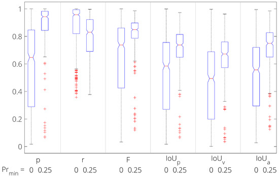 A one-sided Wilcoxon signed-rank test was used to compare the delineation before and after filtering with . This test was chosen because the before/after delineation scores are dependent and not normally distributed. In this test, the alternate hypothesis is that the score values after filtering minus those before filtering come from a distribution with a median greater than 0. Using a 0.5% (i.e., ) significance level, the alternate hypothesis was accepted for all the delineation scores except recall. In other words, these delineation scores were significantly higher after filtering. The associated p-values of the comparison tests were p: , r: 1, F: , : , : , : .
