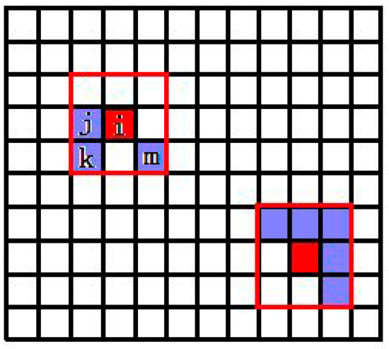 As can be seen from Figure 2, if the current pixel is the i-th observation signal, that is, , selecting its n neighbourhoods as its nearest neighbour (n = 3). Typically, the current pixel is similar to its spatial neighbour, but this requires a prerequisite, that is, the uniform region. If the current pixel is at the border, then the pixels in the red box of Figure 2 may belong to two or more substances. Therefore, in addition to the spatial neighbour as the prior information, we also need to measure the distance between the current pixel and its nearest neighbour to distinguish the pixels which are adjacent to each other but belong to different kinds. As shown in Figure 2, the neighbourhood of the current pixel has a total of 8 pixels, the pixel i is at the boundary, and only the j-th, k-th and m-th endmembers are the same kind of the pixel i. At this point, it is needed to judge by the distance measure to avoid the condition that the boundary is misidentified as the homogeneous region. The detail of measurement process is: first, calculate the Euclidean distance between the current pixel and its nearest neighbour, and then, select the nearest p pixels as the real neighbour of the current pixel.