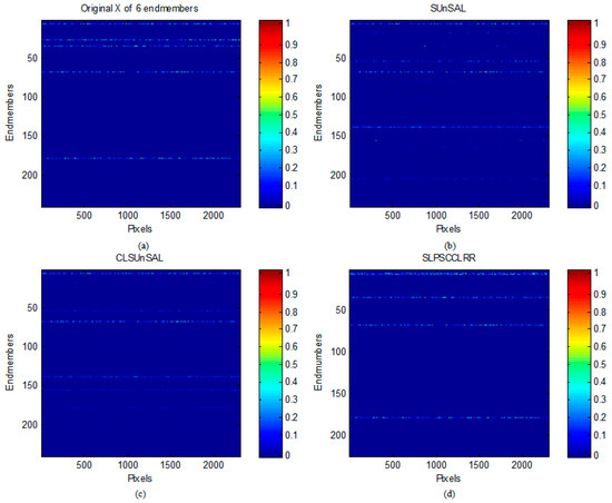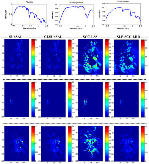 Figure 9 shows a comparison between the fractional abundance maps by applying the SUnSAL, LRR, CLSUnSAL, and the proposed algorithm to the AVIRIS Cuprite scene using the library A. As shown in Figure 9, these endmembers are: alunite, buddingtonite and chalcedony, which are known to be present (in prominent fashion) in the Cuprite mining district [26]. The parameters are set as follows: λ = 1 × 10−3 for SUnSAL, λ = 10 for LRR and λ = 5 × 10−3 for CLSUnSAL. For the proposed algorithm, we set threshold ε to be 0.01, λ = 10 and T = 25. In addition, the ASC constraint is not applied in our models in this section.