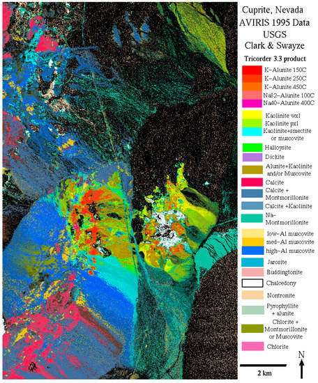 USGS map showing the location of different minerals in the Cuprite mining district in Nevada. The map is available online at http://speclab.cr.usgs.gov/cuprite95.tgif.2.2um_map.gif.
