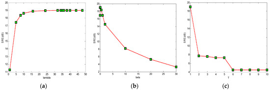 SRE in relation to lambda (a), beta (b) and T (c) for DC2 with SNR = 30 dB.