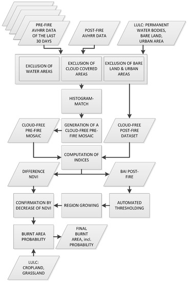 The required input parameters of the developed burnt area mapping procedure (Figure 2) are (I) an AVHRR scene acquired during or after the fire event (post-fire), (II) a series of pre-event AVHRR acquisitions of the 30 days prior to the fire event, and (III) a land use land cover classification (LULC) [37].
