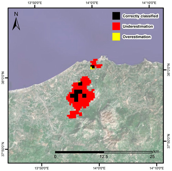 Both reference burn scars of the Sicily test site were detected (Figure 4). However, a large part of the reference burnt area was missed by the classification. On the other hand, there was almost no overestimation.