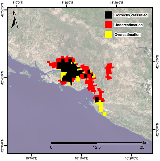 Test site Croatia: Validation of the AVHRR-based burnt area mapping with the MODIS reference MCD64 for a fire event on 4–5 August 2007. Correctly classified burnt area by AVHRR (black), missed by the AVHRR processor (red), overestimated by the AVHRR processor (yellow).