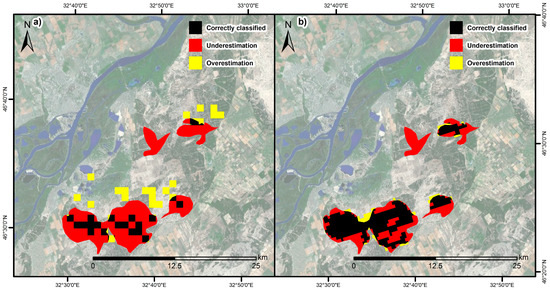 Test site Ukraine: (a) Validation of the AVHRR-based burnt area mapping with burnt area derived from Landsat-7 imagery for a fire event on 21 August 2007. (b) Validation of the MODIS MCD64 burnt area product with burnt area derived from Landsat-7 imagery for the same fire event as that shown in (a). Correctly classified burnt area (black), missed burnt area (red), overestimated by the classification (yellow).