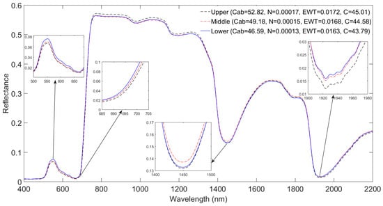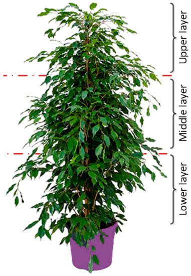 For each leaf sample measurement, approximately three (3) gram of fresh leaves (between six to ten leaves-depending on leaf size and weight) were randomly sampled from the upper, middle and lower canopy vertical layers for each plant (Figure 1). At each of three canopy layers, leaf samples were picked from both the outer and interior canopy in all directions. The three layers were determined based on the height of a plant along the stem. We divided the canopy into three layers for two reasons. Firstly, the plants used in this study were relatively short (mean height ~85 cm) to identify and characterize more than three canopy layers. Secondly, three canopy layers match forestry and agronomic standards in reporting research in canopy layers [,]. The leaves picked from the three canopy layers were stored in a portable cooler and all laboratory measurements were performed within two hours of leaf picking. Leaf directional hemispherical reflectance from 350 to 2500 nm for each sample was measured using an ASD FieldSpec-3 Pro FR spectroradiometer coupled with an ASD RTS-3ZC Integrating Sphere. To minimize spectral noise, the spectroradiometer was set to average two hundred scans into a single spectrum per each spectral measurement. The spectra were calibrated for dark current and stray light following the Integrating Sphere User Manual instructions []. During spectral measurements, care was taken to avoid leaf primary veins. Spectral measurements of leaves constituting a sample were averaged to a single spectrum that represented the spectra of each sample. In total spectral reflectance measurements were performed on 120 samples (40 plants × 3 canopy layers). A moving second order Savitzky-Golay filter [] with a frame size of 11 was applied on each sample spectra to minimize instrument noise. Due to the low signal-to-noise ratio for wavelengths after 2200 nm as well as spectral bands before 400 nm, the spectra were cropped to 400–2200 nm range. Therefore, 1801 spectral bands were retained for further analysis.