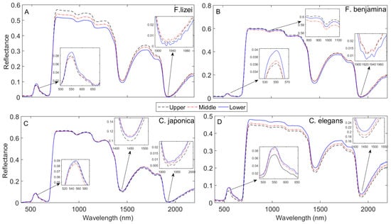 Species-specific mean leaf spectral reflectance at each canopy position for F. lizei (A), F. benjamina (B), C. japonica (C) and C. elegans (D).
