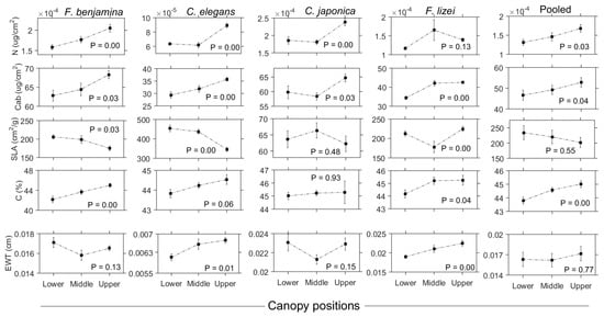 Cab, N, and C demonstrated a significant (P ≤ 0.05) ascending pattern in order of lower > middle > upper canopy layers for individual species as well as the pooled dataset (Figure 6). This demonstrated that upper canopy leaves contained higher trait content than shaded lower canopy leaves. Among all, it was noted that F. lizei demonstrated a contrasting pattern for N, with high foliar N values in the middle layer compared to the bottom and upper layer. SLA was observed to be generally lower in the upper canopy layers compared to middle and lower layers. Again it was noted that F. lizei demonstrated significantly (P ≤ 0.05) low SLA values in the middle layer compared to the upper and lower layers. EWT exhibited contrasting patterns among species. For example, C. elegans and F. lizei demonstrated a significant (P ≤ 0.05) increase in EWT values in the order of lower > middle > upper. In contrast, C. Japonica and F. Benjamina demonstrated low EWT values in the middle layer compared to bottom and upper canopy layers. Details of leaf traits comparison across the canopy at the species level and pooled dataset based on the Tukey HSD post hoc test are shown in Table 2. Prominent variability in leaf traits existed between the upper and lower layers of the canopy than any other canopy layer pair.