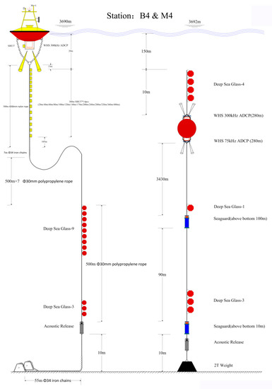 To investigate upper ocean typhoon responses, we deployed a cross-shaped observational array consisting of five moored buoys and four subsurface moorings organized into five stations in the SCS. As an example, Figure 1 shows the design of Station 4, which consisted of a buoy and a mooring. Observed variables included standard meteorological parameters, ocean surface waves, currents at depths from 0 to 850 m, and temperature and salinity measurements from 0 to 400 m and near the ocean bottom. We focused on the upper ocean response to typhoons from 0 to 100 m, thus mooring-measured datasets were not used. Stations 1 and 4 were located on the right of the track of Typhoon Kalmaegi, whereas Station 2 was on the left. All these stations were located within the maximum wind radius of Kalmaegi. Station 2 is much closer to the track than stations 1 and 4. Currents were measured using ADCP at each station: a 150 kHz (Stations 1 and 2) or 300 kHz (Station 4) downward-looking ADCP binned at 8-m (Stations 1 and 2) or 4-m (Station 4) intervals with the first bin at either 14 m (Stations 1 and 2) or 8 m (Station 4) and the last bin at either 246 m (Stations 1 and 2) or 124 m (Station 4) below the surface. The 75 kHz ADCP velocity accuracy is 1% of water velocity relative to the ADCP ±0.01 m/s, and the 150 and 300 kHz ADCP accuracies are 1% ± 0.005 m/s and 0.5% ± 0.005 m/s, respectively.