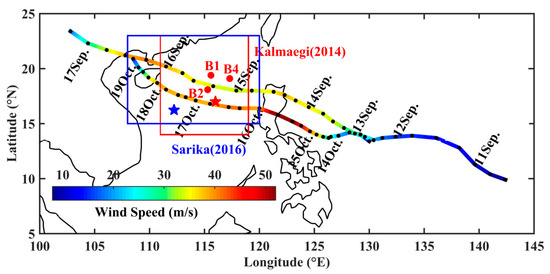 Best track of Typhoons Kalmaegi (2014) and Sarika (2016) from the Joint Typhoon Warning Center. Buoy array positions are marked by red dots (B1, B2, and B4). The red and blue stars denote the positions of Argo floats 5904562 and 5904746. The red and blue boxes mark the focused regions of the Typhoons Kalmaegi (2014) and Sarika (2016). The color bar shows maximum sustained wind speed (m/s), which indicates typhoon intensity.