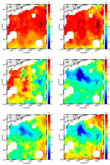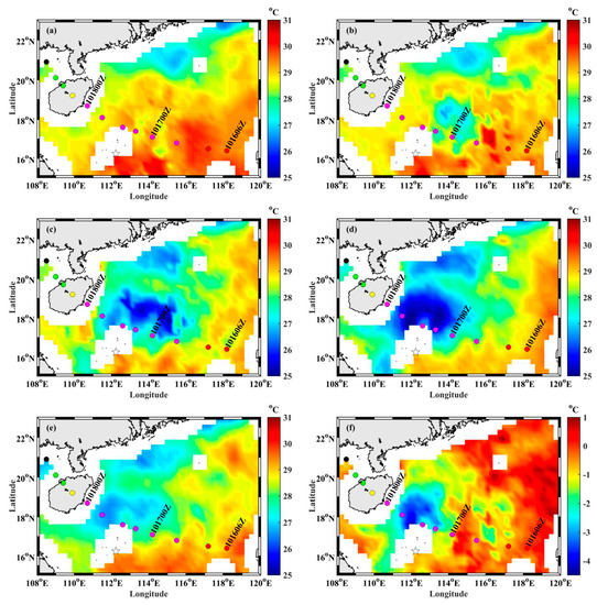 Microwave optimally interpolated SST data showing SST as Typhoon Kalmaegi passed: (a) on 13 September 2014; (b) on 14 September 2014; (c) on 15 September 2014; (d) on 16 September 2014; and (e) on 17 September 2014. (f) SST difference between 16 and 14 September 2014. The color bar denotes the temperature, in units of °C. The colored circles mark the location of the typhoon center at different times, and the colors represent the maximum sustained wind speed (m/s): yellow for 31–35 m/s and magenta for 36–40 m/s. The black star marks the position of Argo float 5904562.