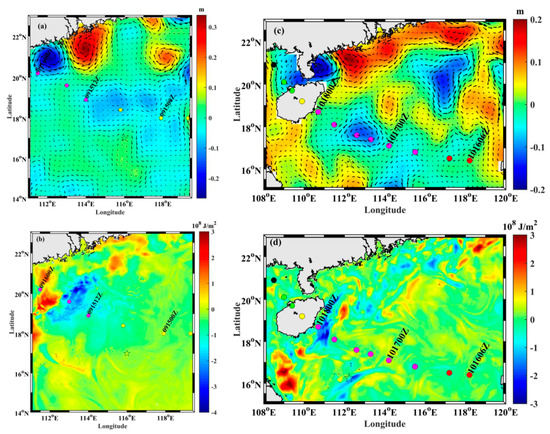 The altimeter-derived SSHA and GVA between post-storm and pre-storm conditions for: (a) Typhoon Kalmaegi; and (c) Typhoon Sarika. The color bar denotes SSHA variation in m. The ROMS-simulated OHC variations between post- and pre-storm conditions for: (b) Typhoon Kalmaegi; and (d) Typhoon Sarika. The color bar denotes the OHC variation in J/m2. The black stars mark the position of the Argo floats. The colored circles mark the location of the typhoon center at different times, and the colors represent the maximum sustained wind speed (m/s): black for <20 m/s; green for 20–30 m/s; yellow for 30–35 m/s; magenta for 35–40 m/s; and red for >40 m/s.