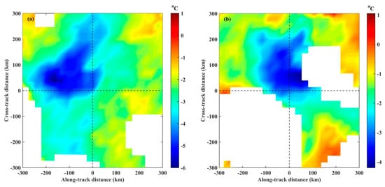 SST changes induced by Typhoons: (a) Kalmaegi; and (b) Sarika. The intersection of the dotted lines marks the location of the typhoon center, and the centers of the Typhoons Kalmaegi and Sarika are at 18.9°N, 114°E and 18.1°N, 111.5°E, and at 12:00 UTC on 15 September 2014 and at 18:00 UTC on 17 October 2016, respectively. The negative direction of the horizontal axis denotes the typhoon’s translation direction. The top and bottom halves of the vertical axis represent the left and right sides of the typhoon track, respectively. The color bar denotes SST variation, in units of °C.