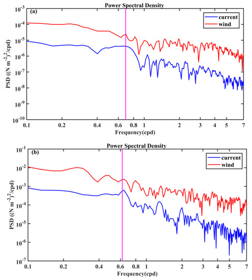 PSD of the wind speed (red lines) and current speed (blue lines) for Typhoon: (a) Kalmaegi; and (b) Sarika. The magenta lines denote the near-inertial frequency.