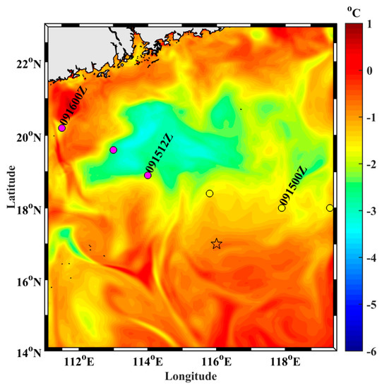 SST response to typhoons is of particular interest because SST plays a key role in energy exchange between typhoons and the ocean. The South China Sea (SCS) is a large, semi-enclosed marginal sea, and is subject to frequent typhoons. Thus, proper characterization of typhoon-induced SST cooling may help improve understanding of typhoon mechanisms and improve typhoon intensity predictions. Previous research found that SST dropped 9 °C after the passage of Typhoon Kai-Tak and 11 °C following Typhoon Lingling [12,13]. Satellite measurements and three-dimensional numerical simulations have shown that typhoon-induced decreases in SST depend strongly on the typhoon’s maximum surface wind speed, translation speed, and size [14,15]. SST cooling amplitude also strongly depends on depth of the mixed layer and thermocline stratification prior to the storm [16,17]. During strong typhoons (greater than or equal to category 4), the subsurface warming expected from vertical mixing is comparable in magnitude to the near-surface cooling; however, for weak typhoons (less than or equal to category 3), only surface cooling occurs, thus suggesting that air-sea heat exchange and vertical advection possibly play an important role in the case of weak typhoons [18]. Rapid intensification occurs when a TC pass over warm eddies owing to the increasing ocean heat content, while storm-induced mixing and SST cooling are suppressed by the warm ocean features. Composited advanced very-high-resolution radiometer observations and buoy measurements showed SST decreases of only about 0.5 °C–1 °C when Hurricane Opal passed over a warm core ring in the Gulf of Mexico [19]. In addition, when Typhoon Maemi, a category 5 storm, encountered a warm ocean eddy in the western North Pacific, there was an analogous SST cooling of approximately 1 °C [20]. Typhoon Maemi’s self-induced SST cooling was suppressed by a thicker upper ocean mixed layer in the warm eddy. This prevented cold water from the deep ocean from being entrained into the upper ocean mixed layer. Moreover, the near-surface barrier layer also suppressed the typhoon-induced upper ocean cooling, leading to temperature changes that were smaller than expected [21]. When typhoon-induced forcing is strong enough to break through the barrier layer base into the thermocline, the barrier layer reduces the cooling magnitude [22].