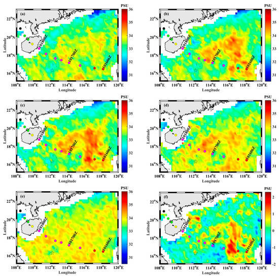 SMAP Level 3 8-day Running sea surface salinity (SSS) data showing the SSS as Typhoon Sarika passed: (a) on 11 October 2016; (b) on 14 October 2016; (c) on 17 October 2016; (d) on 20 October 2016; (e) and on 23 October 2016. (f) SSS difference between 17 October and 11 October 2016. The color bar denotes the salinity, in units of PSU. The colored circles denote the location of the typhoon center at different times and the colors denote the maximum sustained wind speed (m/s): black for <20 m/s; green for 20–30 m/s; yellow for 30–35 m/s; magenta for 35–40 m/s; and red for >40 m/s. The black star marks the position of Argo float 5904746.