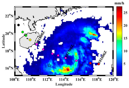 GPM-measured rain rates at 00:00 UTC on 17 October 2016. The color bar denotes rainfall rate in mm/h. White indicates no rain. The black star denotes the position of Argo float 5904746. The colored circles show the location of the typhoon center at different times and the colors represent the maximum sustained wind speed (m/s): black for <20 m/s; green for 20–30 m/s; yellow for 30–35 m/s; magenta for 35–40 m/s; and red for >40 m/s.