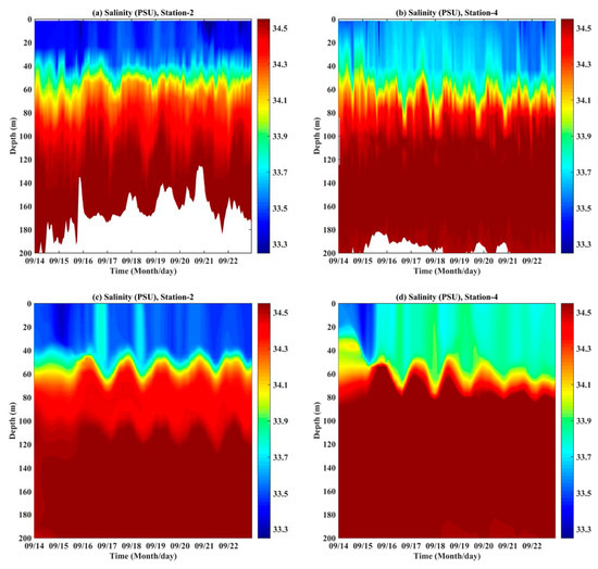 (a,b) CTD-measured salinity at 0–200 m deep at two different stations; and (c,d) ROMS-simulated salinity at 0–200 m deep at two different stations. The color bar denotes the salinity, in units of PSU.
