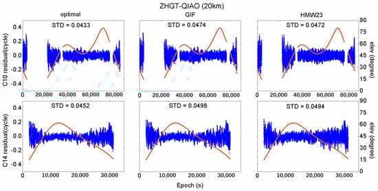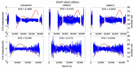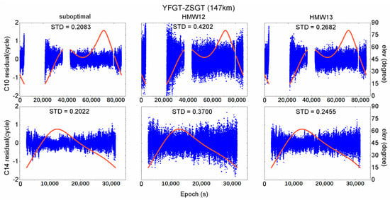 All the selected suboptimal combinations in the three baselines are WL combinations whose wavelength is between 0.75 and 2.93 m [7], so the comparison between the suboptimal combination and the HMW12 or the HMW13 combination is reasonable. From the above three figures we can see that the suboptimal combination achieves the best results in all baselines with a dramatic improvement. The STD of ambiguity residuals for the suboptimal combination of C10 and C14 are only about 0.2 cycles, thus, the AR success rate by directly rounding can be up to 99%. Additionally, no apparent difference is observed between the IGSO and MEO satellites, except for the shortest baseline where the residual for C14 is amplified much larger than the residual for C10. This is because, for short baselines, the effect of the code measurement noise, rather than the ionosphere delay, plays a major role in determining the selected combinations. The code measurement noise suffers more at low satellite elevation angles, and there is a greater percentage of the observation data when C14 at a low satellite elevation angle than that of C10. As the baseline distance increases, the effect of the code measurement noise reduces, and the effect of the ionosphere delay enhances.