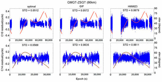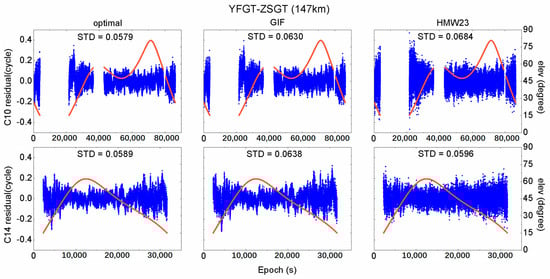Furthermore, the STD values for the three combinations of all IGSO and MEO satellites, the improvement percentages of the optimal combination compared with the HMW23 combination (), and the STD differences between the optimal and the GIF code-phase combinations (), were calculated and are shown in Table 5. Generally, the results in the table coincide with the results for satellites C10 and C14. An overall improvement of optimal combination compared with the HMW23 combination is achieved, with almost 100% AR success rate. In fact, from Figure 2, Figure 3 and Figure 4 we can see that the ambiguity residuals of the optimal combination at high satellite elevation angles are much smaller than those of the HMW23 combination. Additionally, as the baseline length increases, the STD difference becomes smaller and smaller. This indicates that the GIF combination is more suitable for long baselines.