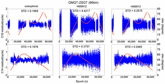 On the contrary, the HMW12 combination shows the worst performance, especially for satellite C10 at low satellite elevation angles. This indicates that the selected suboptimal combination has the lowest total noise level, and we can reliably fix the ambiguity of the suboptimal combination by rounding with a short time span, even in a single epoch. However, relatively more time is required to reliably fix the HMW12 or HMW13 ambiguity through a smoothing technique.