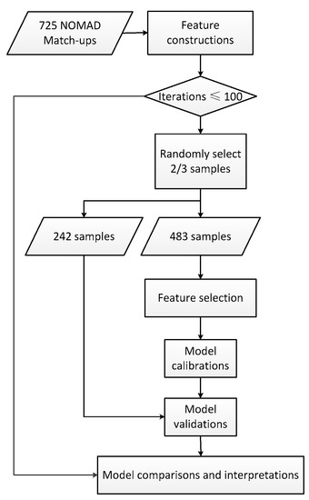 Three main steps are need to develop a statistical PSCs algorithm [16]: (1) constructing input features for selection; (2) selecting sensitive features using feature selection techniques; and (3) calibrating models using statistical methods. In this study, four types of data were used, including ocean color (Rrs at 412, 443, 490, 510, 555, and 670 nm, band indices, aph_443 and bbp_443), temporal (month), biological (Chl a) and physical (PAR, SST, and wind stress) data. In addition to six original Rrs, six continuum-removed spectra and twenty spectral curvature were also constructed [16], which were denoted CR(λ) and CV(λ1, λ2, λ3) with λ1 < λ2 < λ3, respectively. Thus, a total of 39 features were incorporated into feature selections. The modeling framework used in this study is illustrated in Figure 1: