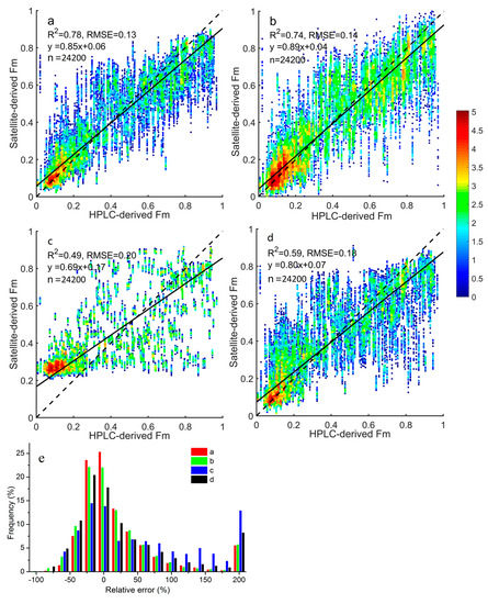 Scatter plots of satellite-derived versus high performance liquid chromatography (HPLC) microplankton size fractions (Fm): (a) random forests using features selected with SVM-RFE, (b) SVM using features selected with SVM-RFE, (c) SVM using ocean color features selected with SVM-RFE, and (d) three-component method. The dashed line is a 1:1 line, and the solid line is a regression line. Plot (e) shows the frequency distributions of their relative errors, and the numbers along the color ramp indicates the pixel density after log transformation (y = ln(x)).