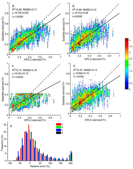 Scatter plots of satellite-derived versus high performance liquid chromatography (HPLC) nanoplankton size fractions (Fn): (a) random forests using features selected with SVM-RFE, (b) SVM using features selected with SVM-RFE, (c) SVM using ocean color features selected with SVM-RFE, and (d) three-component method. The dashed line is a 1:1 line, and the solid is a regression line. Plot (e) shows the frequency distributions of their relative errors, and the numbers along the color ramp indicates the pixel density after log transformation (y = ln(x)).
