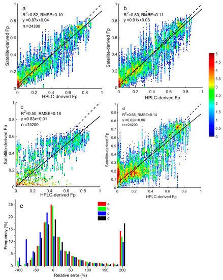 Scatter plots of satellite-derived versus high performance liquid chromatography (HPLC) picoplankton size fractions (Fp): (a) random forests using features selected with SVM-RFE, (b) SVM using features selected with SVM-RFE, (c) SVM using ocean color features selected with SVM-RFE, and (d) three-component method. The dash line is 1:1 line, and the solid is regression line. Plot (e) shows the frequency distributions of their relative errors, and the numbers along the color ramp indicates the pixel density after log transformation (y = ln(x)).