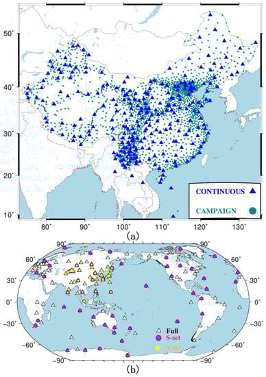 In Figure 1, we present the spatial distribution of the GPS data set. There are more than 260 continuous and 2000 campaign GPS stations in the CMONOC network (Figure 1a). In the routine processing of CMONOC data, we also include 152 globally distributed International Terrestrial Reference Frame (ITRF) stations (Figure 1b) which are candidates for the ITRF2014 reference stations [28].