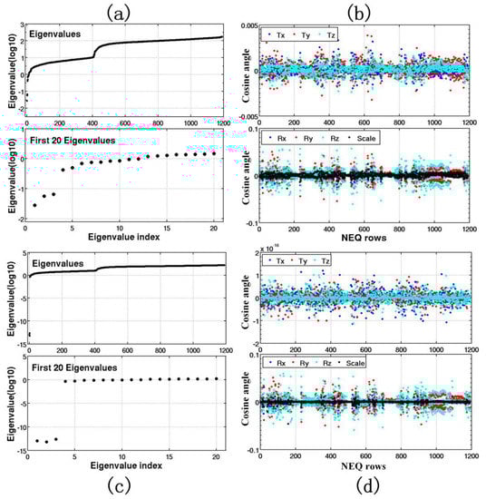 Analogously, we remove both origin and scale datum information from the original NEQ. The corresponding matrix here contains four rows of the similarity transformation matrix . The spectral behavior of the reconstructed NEQ after CDR has four rank deficiencies and the four smallest eigenvalues have a gap of 1012 relative to the rest of the spectrum. The geometrical datum assessment shows orthogonality in both frame origin and scale parameters.
