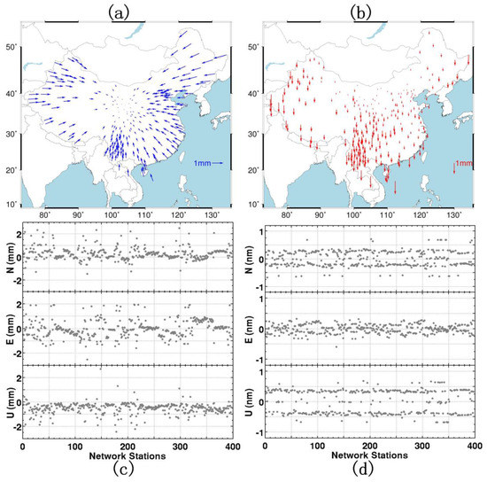 Post-fit residuals between the free network solution and the No-Net-Translation (NNT) solution. Subfigures (a)–(c) depict residuals between the free network solution and the NNT solution upon the NEQ without CDR filtering employed, and (d) depicts similar results but for the NNT solution upon the NEQ with CDR filtering employed; (a,b) are horizontal and vertical maps of post-fit residuals in the CMONOC network, respectively; (c,d) depict station-by-station residual variations in the topographic coordinates. Note that the units in (d) are nm.