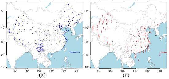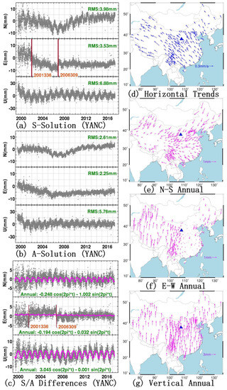 The time series of position differences at station YANChi (YANC) and maps of corresponding derived signals are shown in Figure 6. Taking YANC as an example, we find that the temporal behaviors of the horizontal position differences are random with the magnitude of the variabilities being at the submillimeter level, while the vertical differences are remarkably large and have significant secular and periodic features (Figure 6a). Extending to other stations in the CMONOC network, both the pattern of the vertical trends and the vertical annual signals that are derived from the vertical time series of position differences are homogeneous; the magnitude of the vertical trends can reach up to 0.3–0.5 mm/a; the amplitude of the annual signals are about 1 mm; and the annual harmonic functions reach their peaks in February for almost all CMONOC stations.