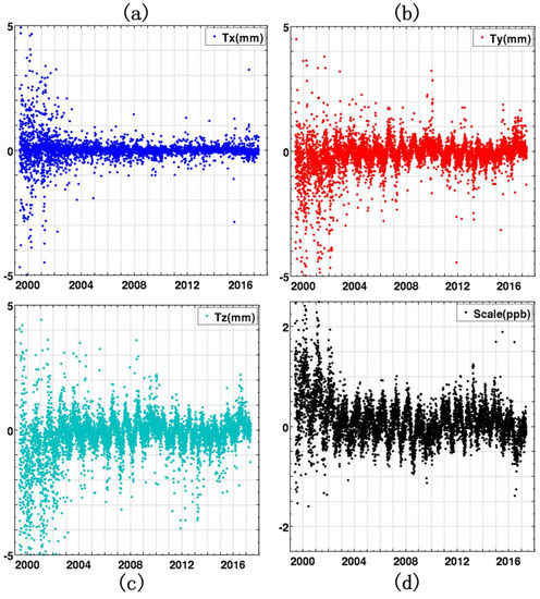 To further elaborate the coupling relationship, two sets of position time series were computed by applying MCs via the NNT condition to the NEQ with only origin-related datum contents removed (the NNT solution), and via NNTS conditions to the NEQ with both origin- and scale-related datum contents removed (the NNTS solution), respectively, and temporal behaviors of their differences were investigated. The comparison considers two basic aspects of the differences, namely the estimated full similarity transformation parameters between the NNT solution and the NNTS solution, and their position differences. For this test, the NNT and NNTS solutions were computed in ITRF2014 using the reference stations shown in Figure 1b (S-set) with a prior weight matrix set to an accuracy level of 10−5 m for the frame origin and scale fixation.