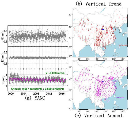 Time series of position differences and maps of derived vertical signals. (a) The time series of position differences between the NNT solution and the NNTS solution at station YANChi (YANC), which is highlighted as a blue triangle in (b) and (c); (b) the distribution of the derived vertical secular trends; and (c) phase (arrow direction) and amplitude (arrow length) of the derived vertical annual signals. The length of the vector in (c) represents the amplitude, and the phasors point directly in the direction of the maximum (‘up’ = max in January, ‘right’ = max in April, ‘down’ = max in July, ‘left’ = max in October [27]).