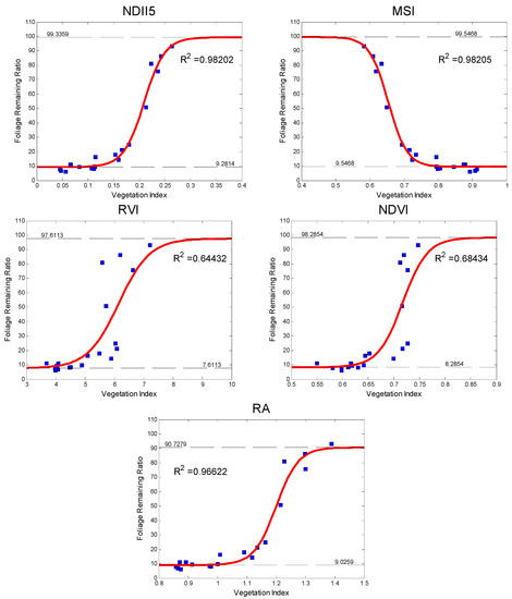 Third, the foliage remaining ratio of each plot was inverted by the plot average defoliation ratios. Fourth, for each VI, a scatter diagram of the average VI and foliage remaining ratio for each plot was drawn and regressed with a special proper regression function.
