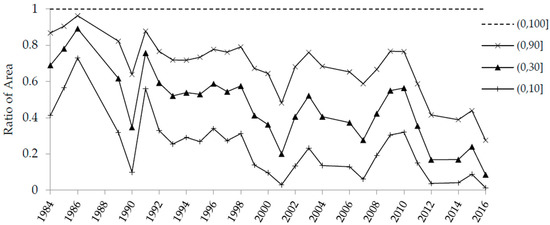 Next, the foliage remaining ratios for all pine pixels in the whole study area in the 29 years were calculated. Figure 5 shows the area proportion changes of the foliage remaining ratios at different ranges by year. The area proportion was the ratio of pine area (in special foliage remaining ratio range) in the total pine area. Four foliage remaining ratio (%) ranges of (0,10], (0,30], (0,90], (0,100] were analyzed.