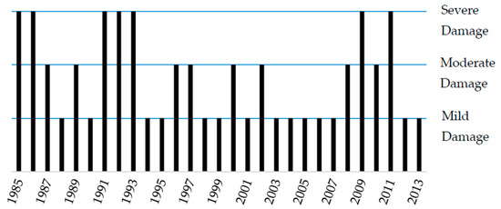 Figure 6 shows the historical degrees of damage by the pine caterpillar in the study area supplied by the local forest protection station. Comparing Figure 5 and Figure 6, it was found that severely damaged years (e.g., 1985, 1986, 1991, 2009) owned low foliage remaining ratios of pine forest (the proportions of (0,10) were big), and in contrast, lightly damaged years (e.g., 1990, 2001, 2007, 2012) owned high foliage remaining ratios of pine forest (the proportions of (0,10) were small). The comparison proved the reliability of the inversion results.