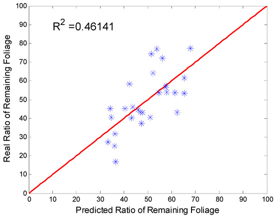 The degree of damage to thepine forest is usually represented by the foliage loss ratio (or foliage remaining ratio) directly. However, in this part, the VI NDII5 was selected to indicate the severity of the caterpillar and construct the prediction model instead of the foliage remaining ratio. According to Equation (2), when the NDII5 increased, the foliage remaining ratio increased and the pine forest was healthier. Though the equation was not linear, it proved feasible to use NDII5 to represent the degree of damage to the pine trees by the following results.