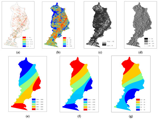 The raster maps of seven variables in the prediction process for the year 2012. (a) NDII5 of year 2011; (b) Distance with the pine forests severely damaged in the 2011, unit was meter; (c) Slope, unit was degree; (d) Aspect, unit was degree; (e) Average active accumulated temperature of years 2008–2012 (Last August–July, >6 °C), unit was °C; (f) Average Sunshine Duration of years 2008–2012 (Last August–Last October and April–July), unit was hour; (g) Average October Rainfall of years 2008–2012, unit was.