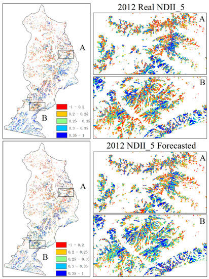 The comparison of the predicted NDII5 and the real NDII5 maps of the study area in the year 2012. Places A and B are the two same regions zoomed in.