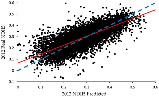 Comparison of the predicted NDII5 and the real NDII5 of 8692 tested points in 2012. The dashed line was the standard line of 1:1, and the solid line was the regressed line of the sample points with the least square regression method.