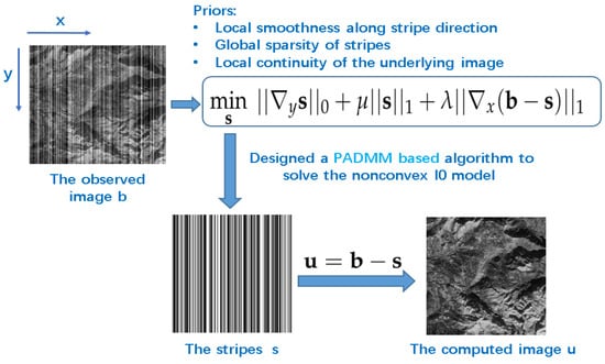 In this paper, to remove the stripes of remote sensing images, we propose a non-convex sparse model which mainly consists of three sparse priors, including an sparse prior by fully considering the directional property of stripes (y-axis), an sparse prior by considering the discontinuity of underlying image (x-axis), and the sparsity of stripes by considering the structural property of stripes. The framework of the proposed method is shown in Figure 1. Moreover, we design a proximal alternating direction method of multipliers (PADMM) based algorithm to solve the proposed non-convex sparse model. Actually, PADMM method mainly incorporates a proximal term into the well-known ADMM method which has been applied to many image processing applications, e.g., image deblurring [28], image denoising [29], tensor completion [30], etc. Note that, after adding this additional proximal term, the resulting algorithm is actually not an ADMM algorithm. The Karush–Kuhn–Tucker (KKT) conditions is the first-order necessary for a solution in nonlinear programming to be optimal. In particular, the convergence to the KKT point of the optimization problem is theoretically proven in the work.