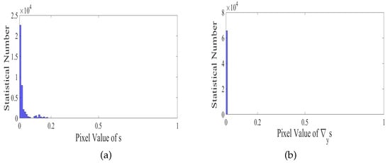 The number of nonzero elements of (a) and (b), where is estimated from a real image example (see Figure 3) by the method [26]. The y-axis represents the number of nonzero elements of and , respectively, and the x-axis stands for the image pixel value whose range is [0, 1].