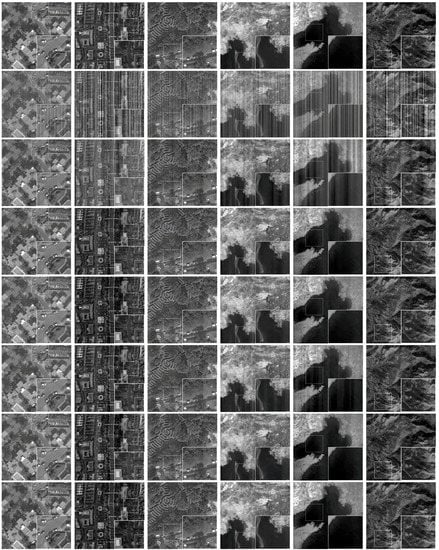 In simulated experiments, the stripes with periodic (Per) and nonperiodic (NonPer) noise are mainly determined by “Intensity” and r. Here, the “Intensity” means the added absolute value of the stripe scope, and the r represents the stripes ratio level within the remote sensing images. For convenience to compare, different stripes added to remote sensing images will be denoted as a vector with three elements, e.g., (Per, 10, 0.2) which represents the periodic stripes, the “Intensity” 10 and stripes ratio 0.2.